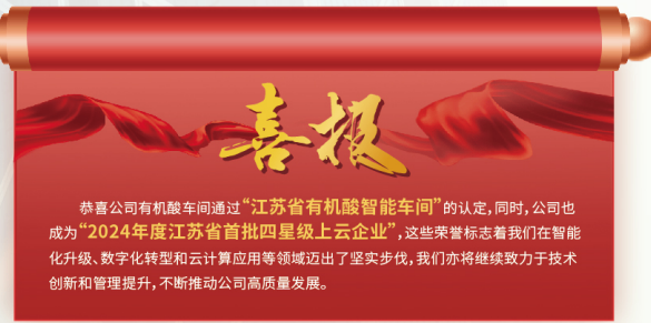 恭喜公司有機酸車間通過“江蘇省有機酸智能車間”的認定,同時,公司也成為“2024年度江蘇省首批四星級上云企業”,這些榮譽標志著我們在智能化升級、數字化轉型和云計算應用等領域邁出了堅實步伐,我們亦將繼續致力于技術創新和管理提升,不斷推動公司高質量發展。